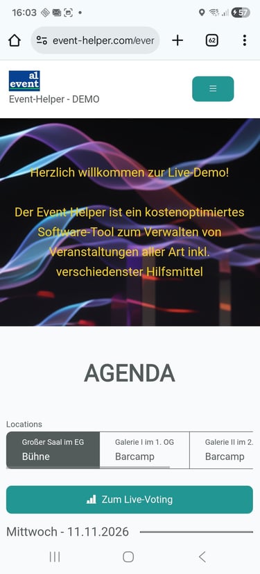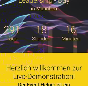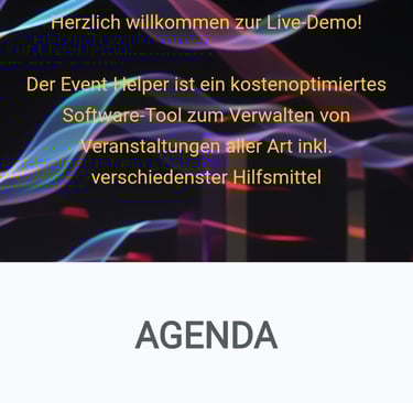 Der Event-Helper ist ein kostengünstiges Tool, welches Ihre Veranstaltung inkl. QR-Code Check-In / Check-Out mittels Scanner, Darstellung der Agenda in Echtzeit, Beschreibung von Workshops und Räumlichkeiten, Themeninhalte einzelner Speaker inkl. Hintergrundinformationen sowie eine Beteiligung an Umfragen während der Veranstaltung auf das Handy der Teilnehmer bringt. Eine umfangreiche Teilnehmer- und Dokumentenverwaltung unterstützt Sie zudem bei der Planung und Durchführung Ihrer Veranstaltung. Bei Bedarf bereiten wir für Sie von der Einladung bis zum Check out alles vor.
